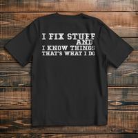 Oversize Biker Rückendruck T-Shirt: I Fix Stuff And I Know Things That's What I Do - Black / S