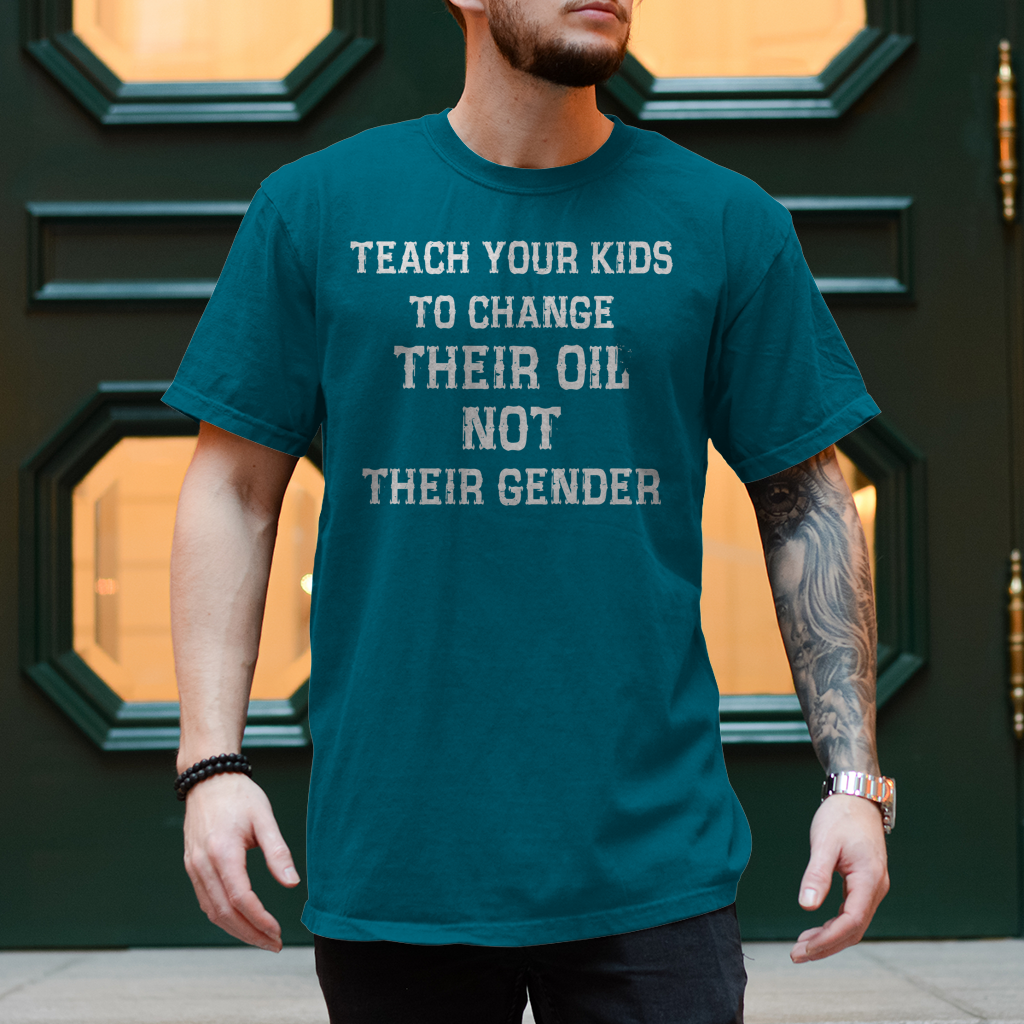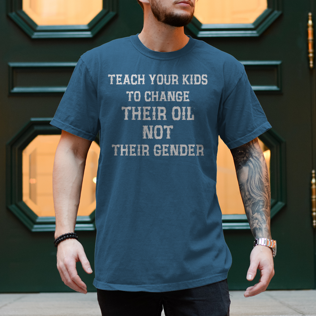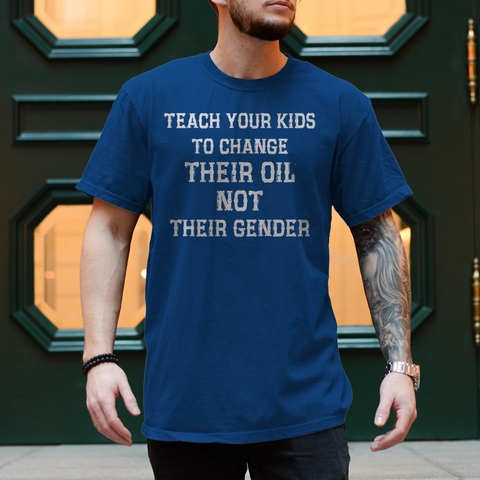 Biker T-Shirt: „Teach Your Kids to Change Their Oil, Not Their Gender“ Brustdruck Sale