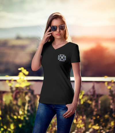 Chopper-Freunde Damen Basic V-Neck T-Shirt: Brust und Rücken Druck Chopper-Freunde Damen Basic V-Neck T-Shirt: Brust und Rücken Druck